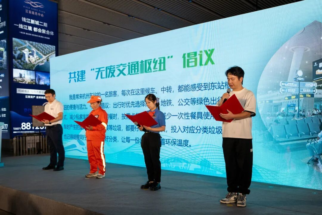 杭州东站商户、旅客、保洁员及物业代表齐声宣读《共建“无废交通枢纽”倡议书》,呼吁广大市民参与垃圾分类、光盘行动,享受绿色生活,共同营造绿色、环保的出行环境。