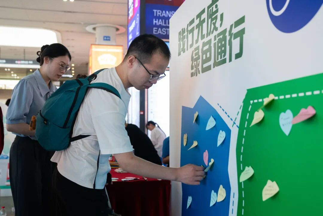 在互动游戏区,来自中国美术学院等高校的“站小青”志愿者团队开展环保创作、互动游戏等服务。“站小青”们紧扣“无废”理念与文化传承双重主题,即兴创作环保主题小物料赠送旅客,垃圾分类闯关、环保套圈等游戏吸引了众多旅客的参与,让旅客在轻松愉快的氛围中学习环保知识。此外,“无废交通枢纽”心愿墙也吸引了不少旅客驻足,大家纷纷写下自己心中“无废交通枢纽”的模样和期待,表达了对绿色出行的美好向往。